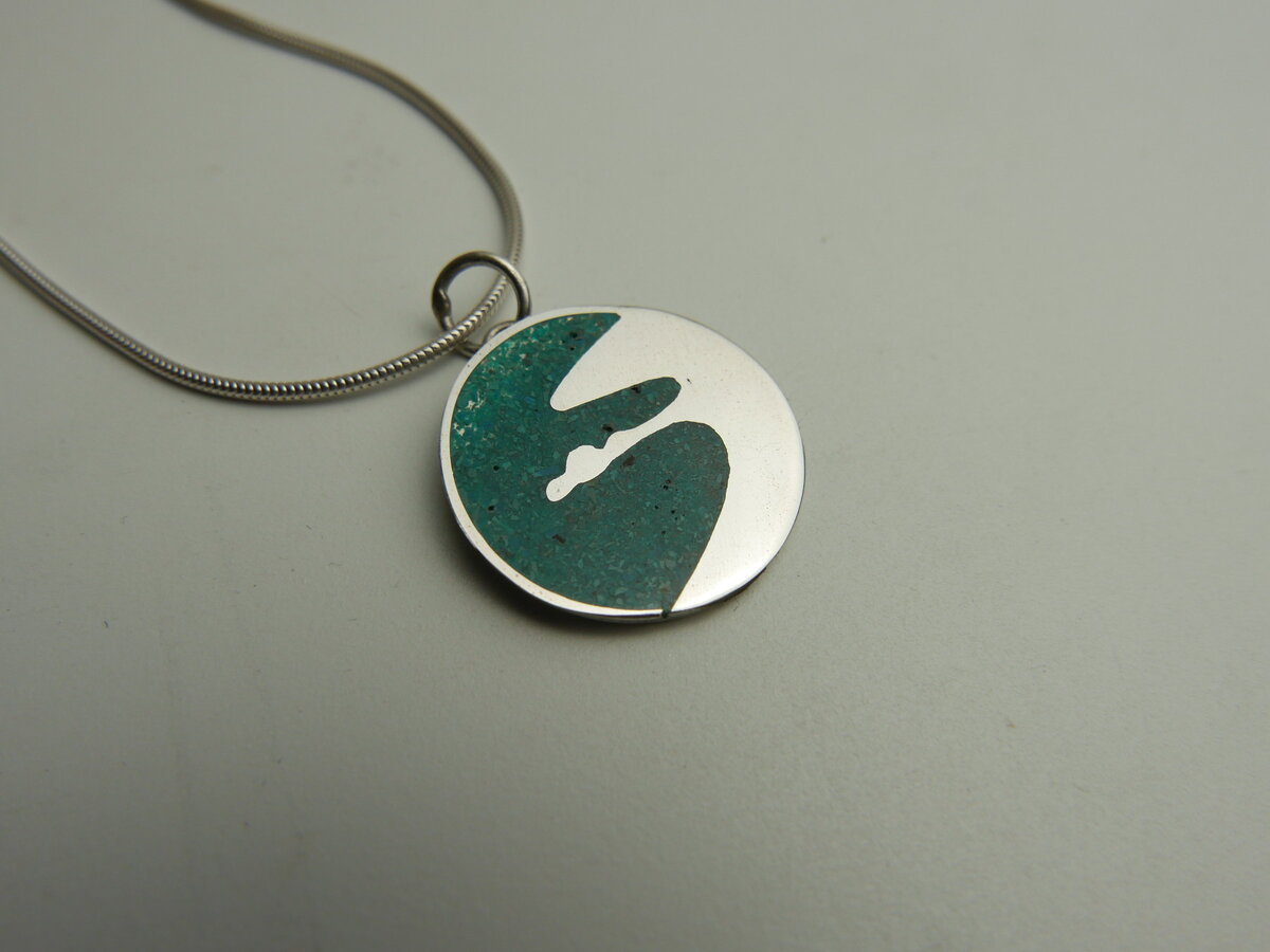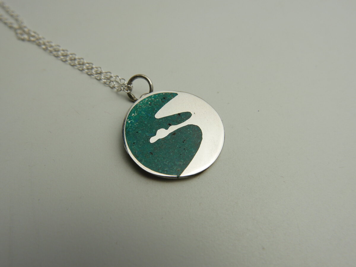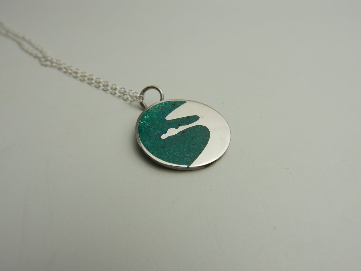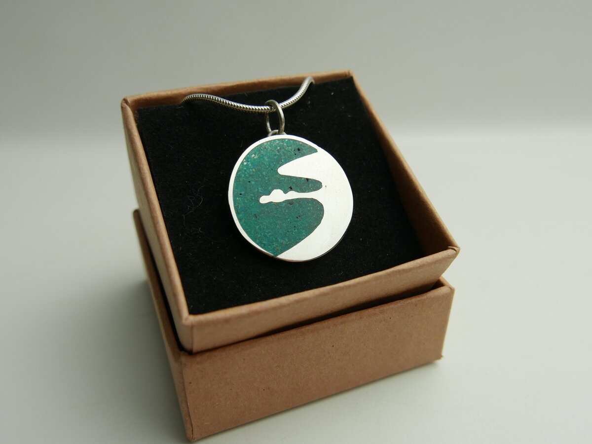 Penjoll de la badia de Blanes amb un trencadís de crisocol·la formant el mar mediterrani. S'entrega amb una cadena de tipus serp de 44 cm.