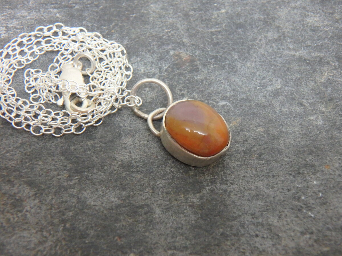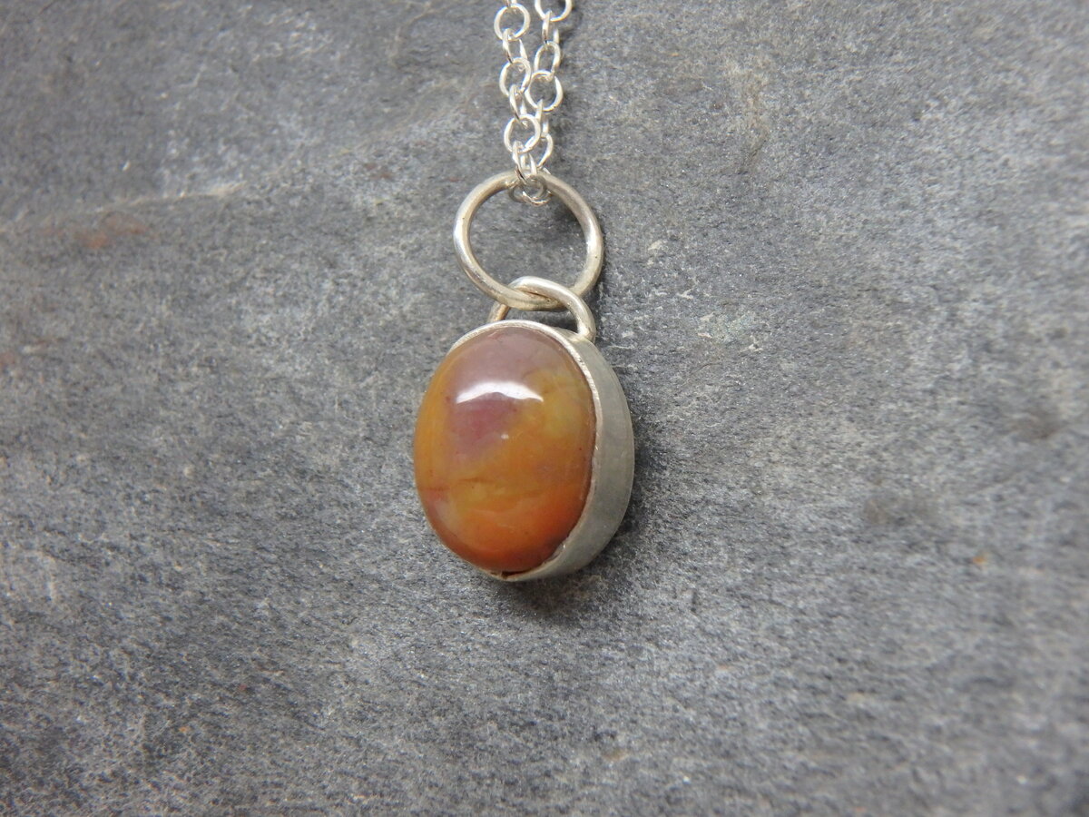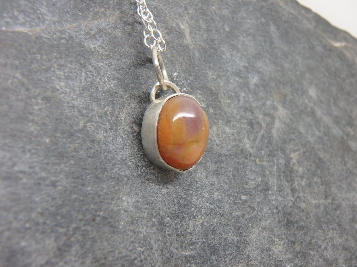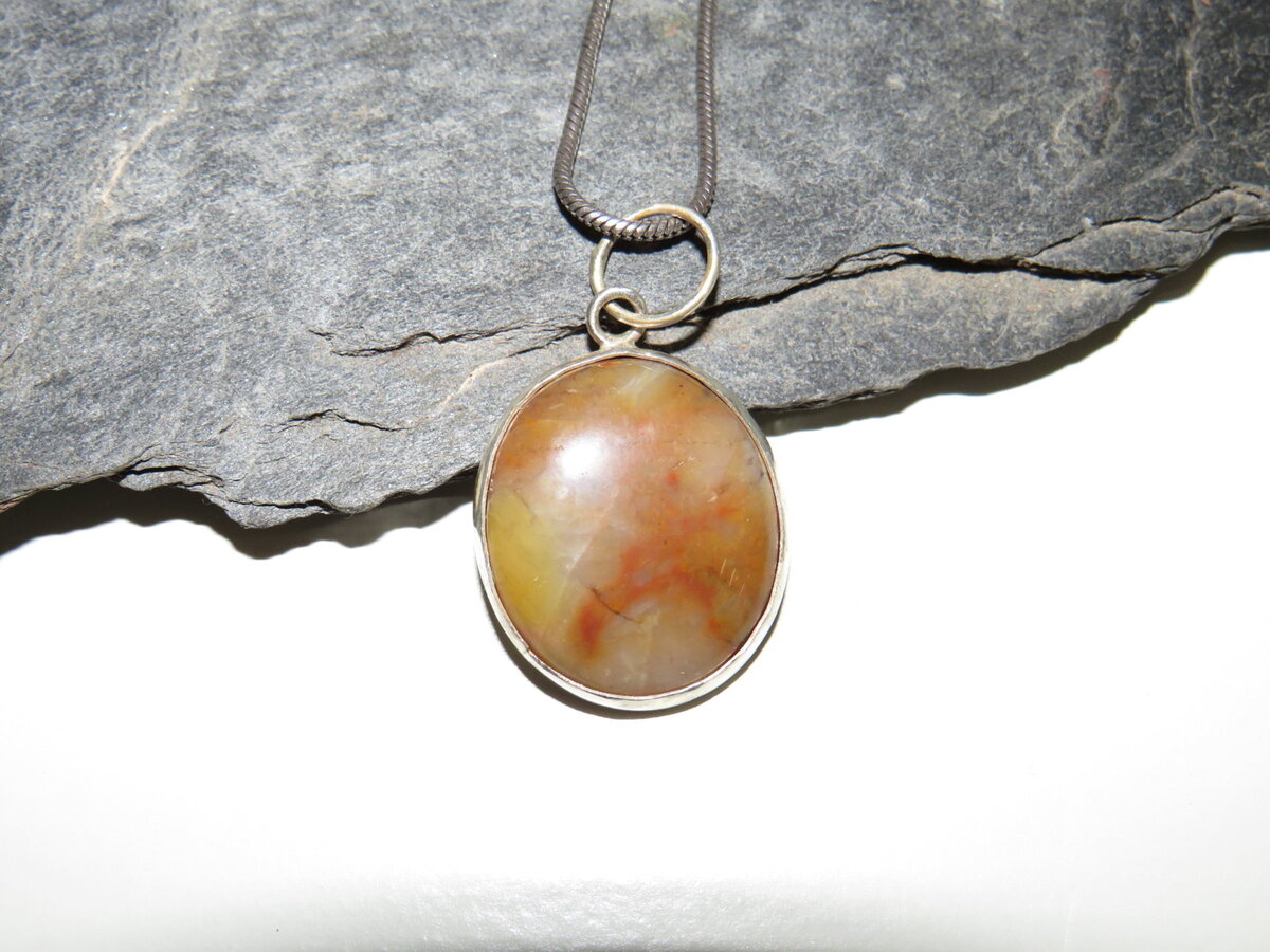 Penjoll amb un caboixó de jaspí de la ciutat de Barcelona. Amb unes aigües de colors taronges i vermells ben especials. S'entrega amb cadena tipus serp de 44 cm.