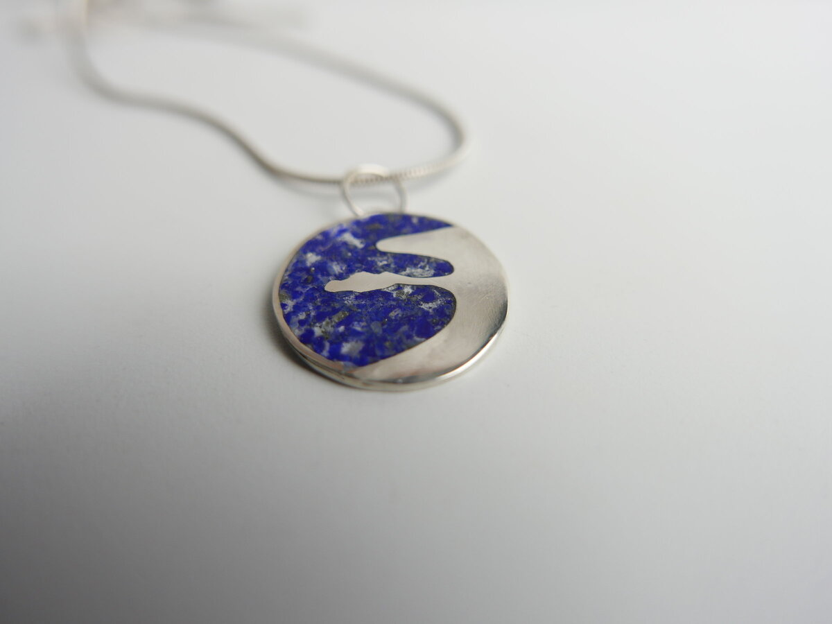 Penjoll de la badia de Blanes amb un trencadís de lapislàtzuli formant el mar mediterrani. S'entrega amb una cadena de tipus serp de 44 cm.
