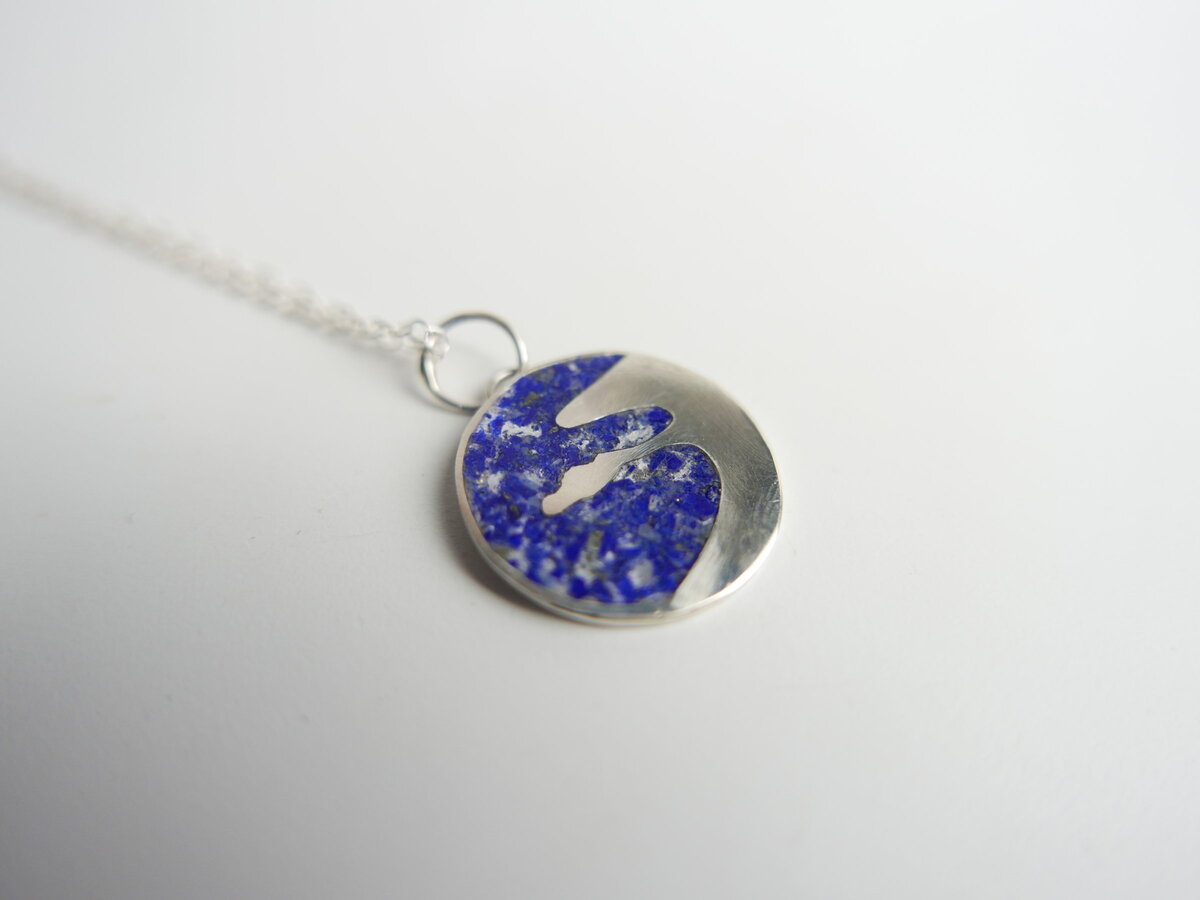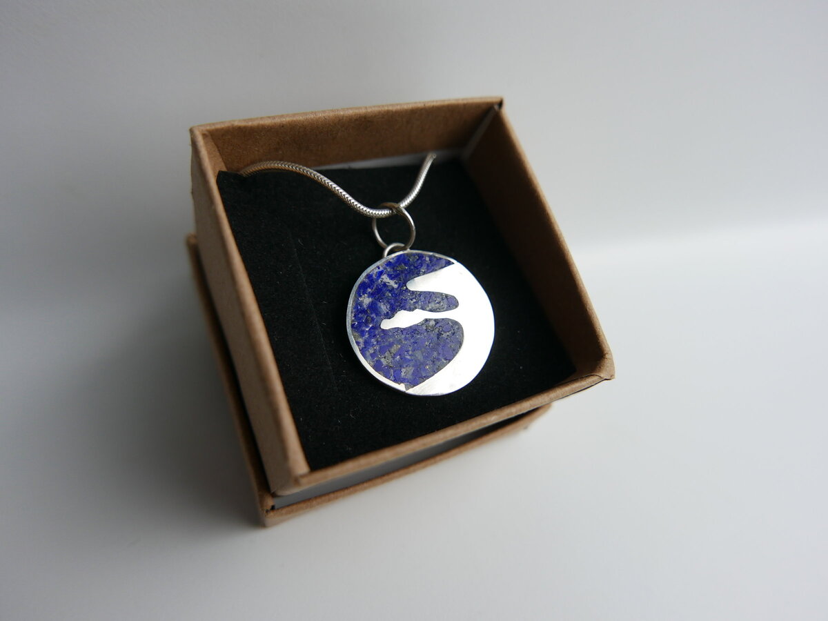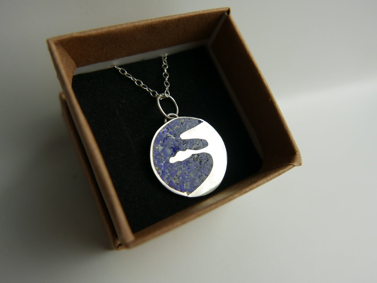 Penjoll de la badia de Blanes amb un trencadís de lapislàtzuli formant el mar mediterrani. S'entrega amb una cadeneta de 44 cm.