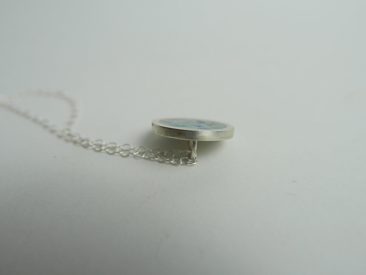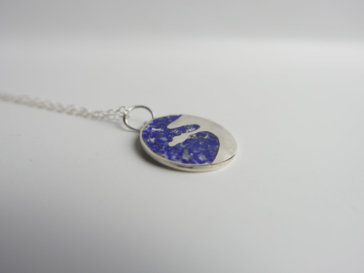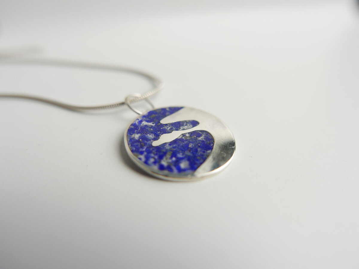 Penjoll de la badia de Blanes amb un trencadís de lapislàtzuli formant el mar mediterrani. S'entrega amb una cadeneta de 44 cm.