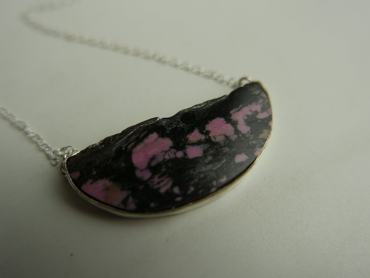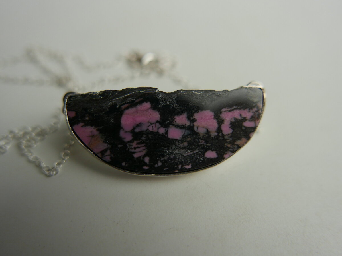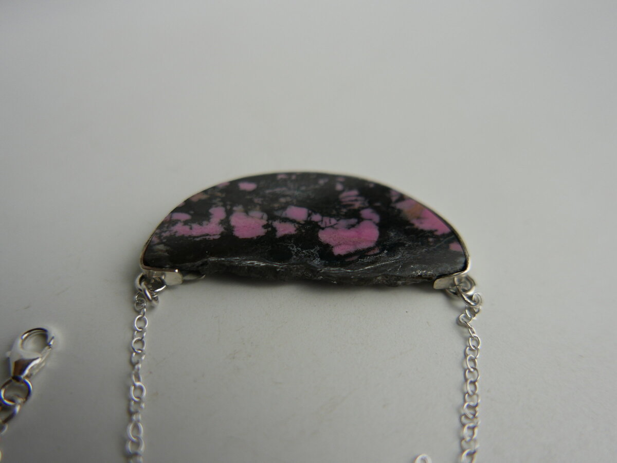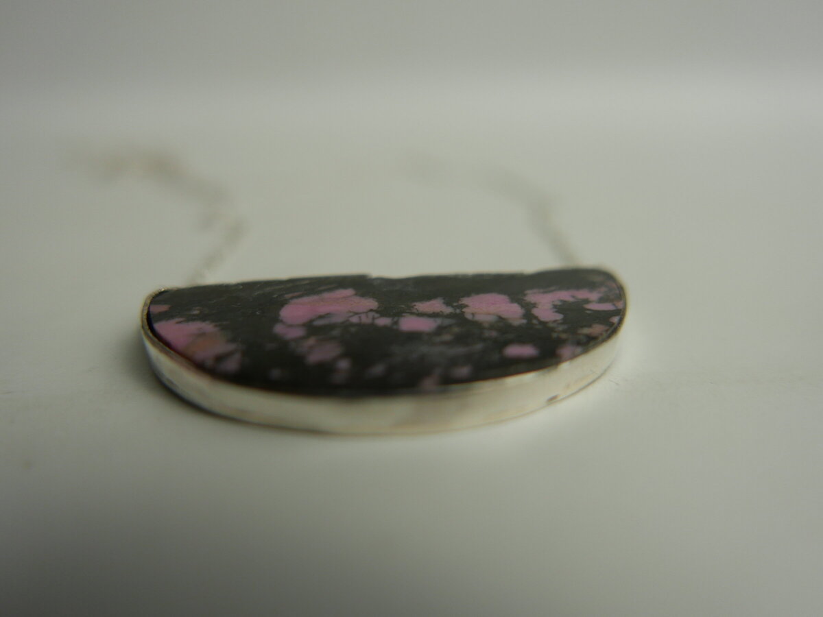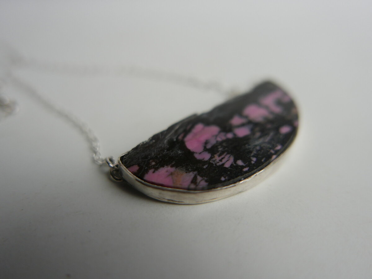 Penjoll de Rodonita en forma de mitja lluna plana i polida amb la seva cadeneta, senzill i elegant.