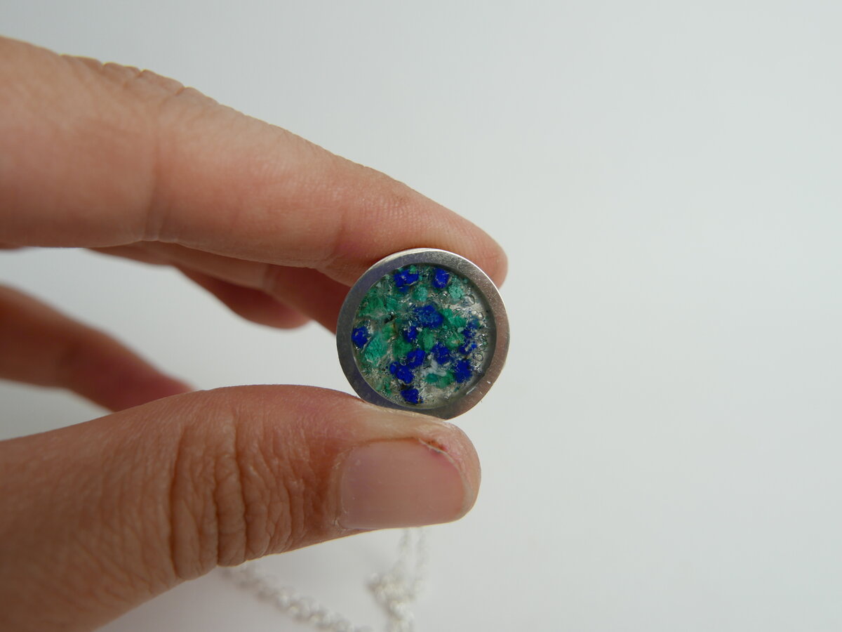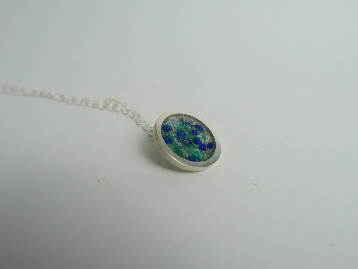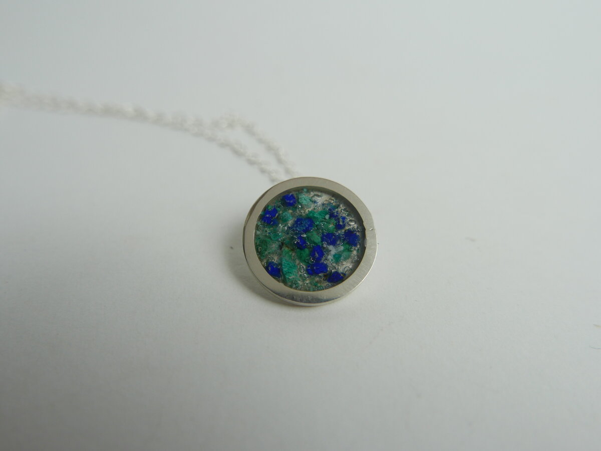 Penjollamb trencadís d'Atzurita i malaquita de tordera. S'entrega amb una cadeneta de 44 cm.
