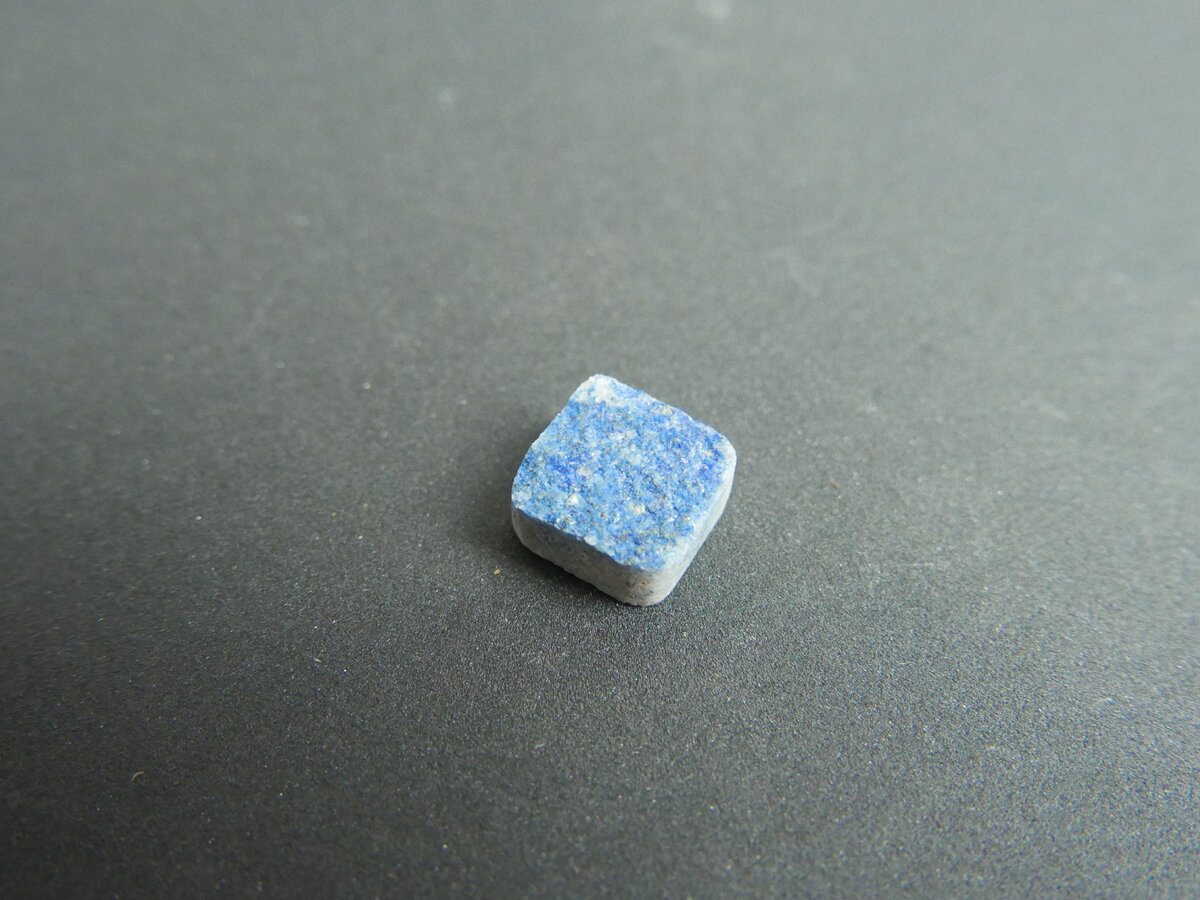 Caboixó d'atzurita de la Vall d'Uixó (Castelló). Fa 8mm x 8mm x 3,5mm.