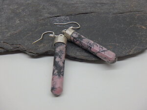 Noves arracades de rodonita del priorat. Són llargues i penjants amb mobilitat on s'aprecia el mineral per complet: Col·lecció Priorat